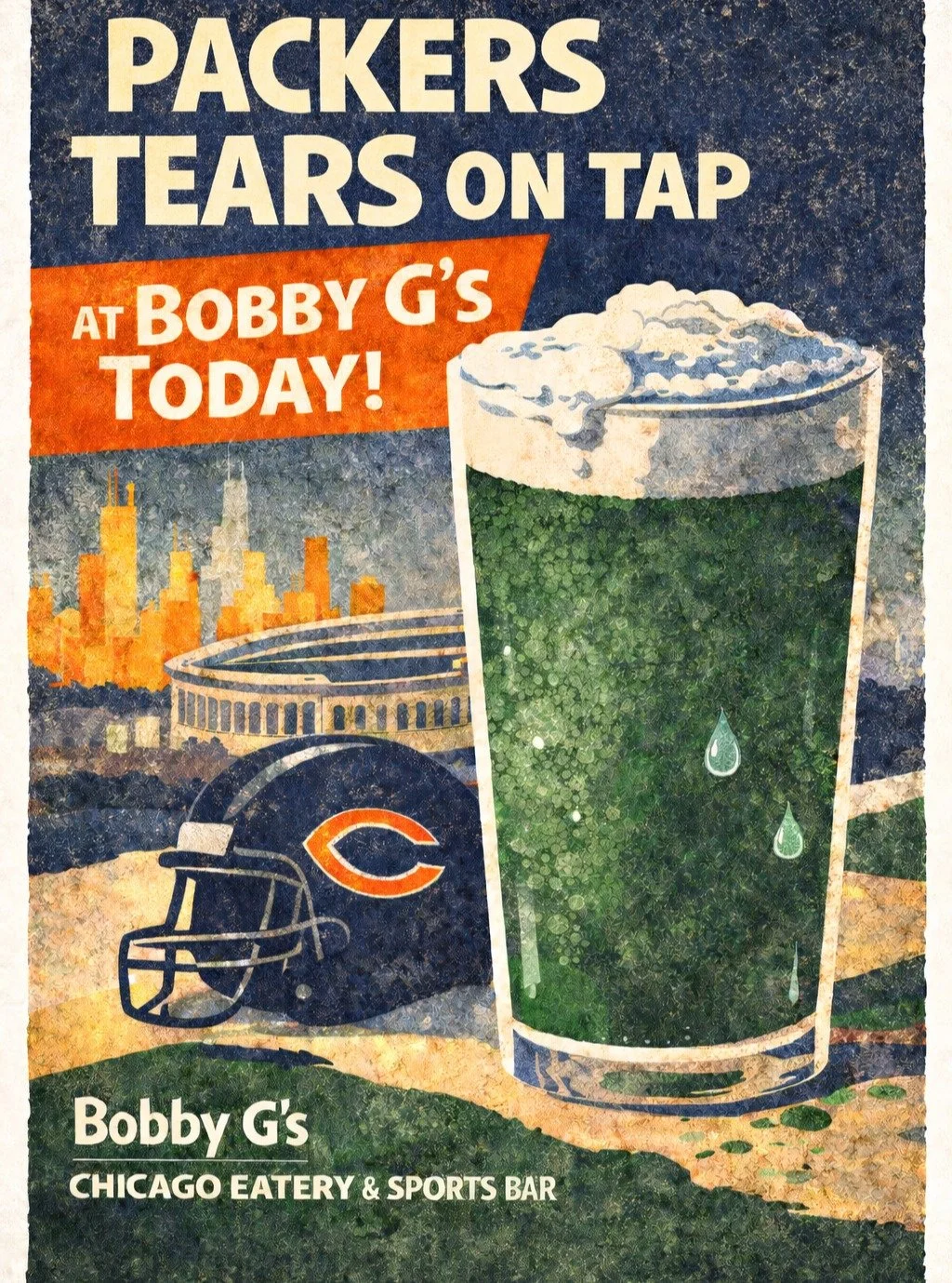 Stop by Bobby G's today — Packers Tears on tap all day long. Salty, cold, and absolutely delicious. Pairs nicely with cheese curds. 🧀😭